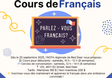 20 Sep 2025 au 08 Nov 2025 4617 62 Street, Unit 120📚 Apprenez le français avec l’ACFA ! ✨ Débutants ou francophones souhaitant.