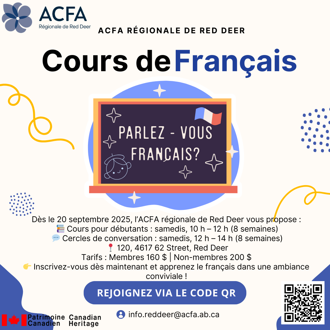 📍 Lieu : Salle multifonction de l’ACFA – 120, 4617-62 Street, Red Deer